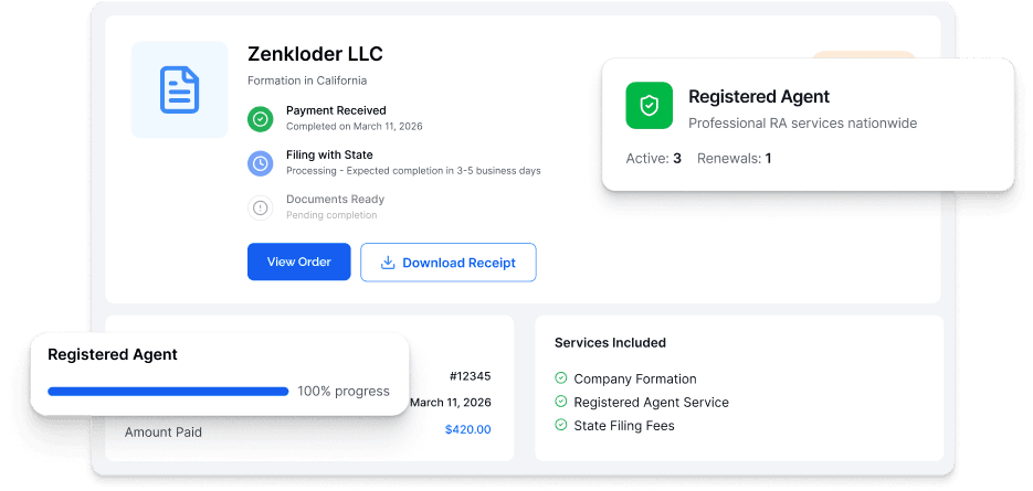 Every LLC and corporation must have a Registered Agent to receive service of process and legal correspondence from the state. Without one, your business could face penalties or lose good standing.